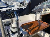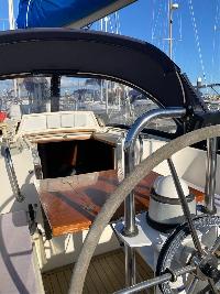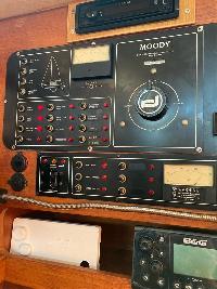 Steering pedestal, navigation and engine instruments, engine controls, two stainless steel grab handles to companionway, console over companionway hatch for navigational instruments.