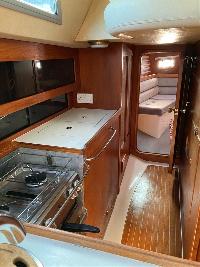 The light, airy saloon has a U-shaped settee to starboard with a single settee berth opposite.