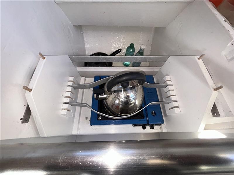 To Starboard: Galley (Portable Gas Cartridge Stove), Seating and Storage further forward.
