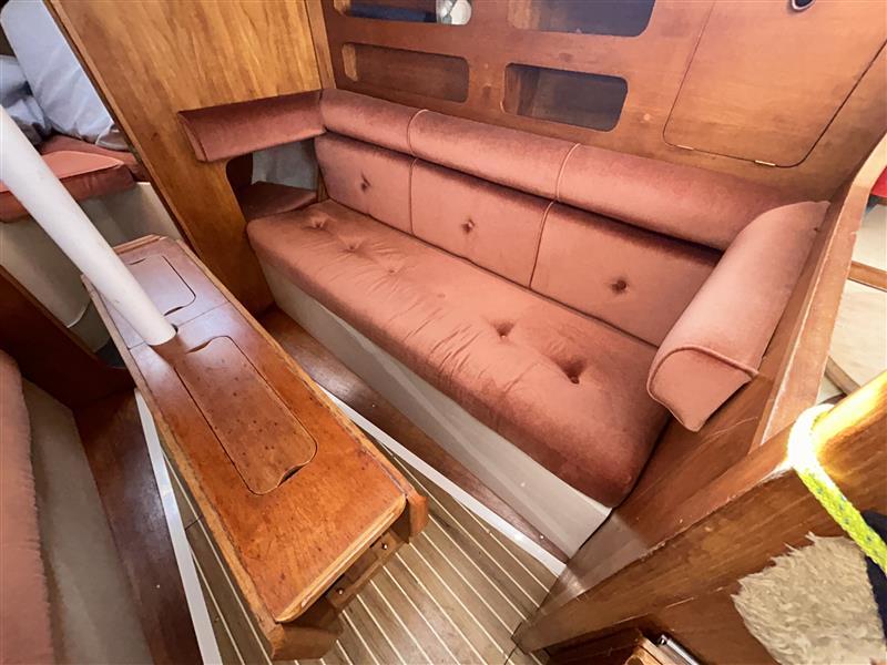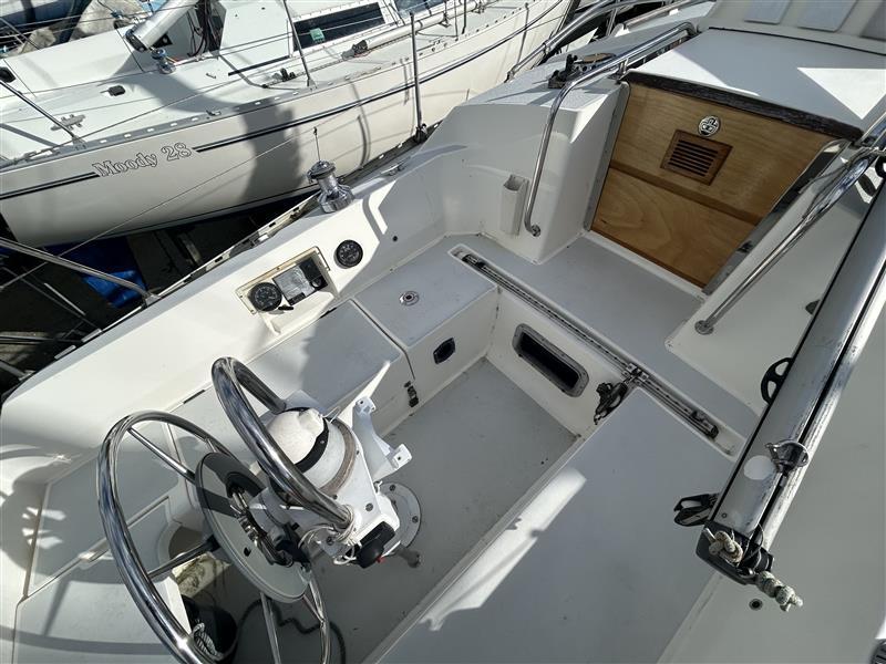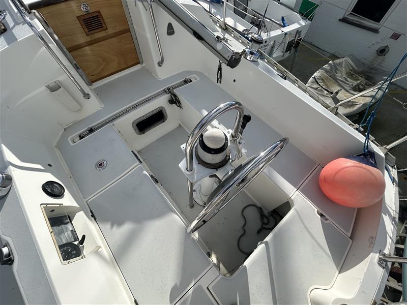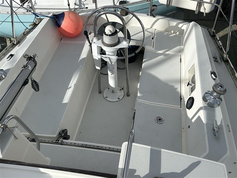 COCKPIT: Seating, Lazarette Locker, Gas Locker (2 Bottles), Wheel, Instruments above Companionway.