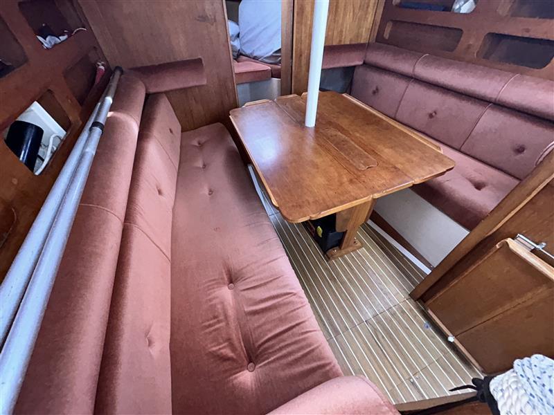 SALOON: Navigation Station to Port, Galley (H&C Sink, Gas Hob, Grill and Oven to Starboard). Seating / Berths to Port and Starboard, Central Table with Folding Leaves and Storage.