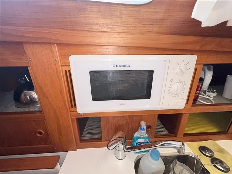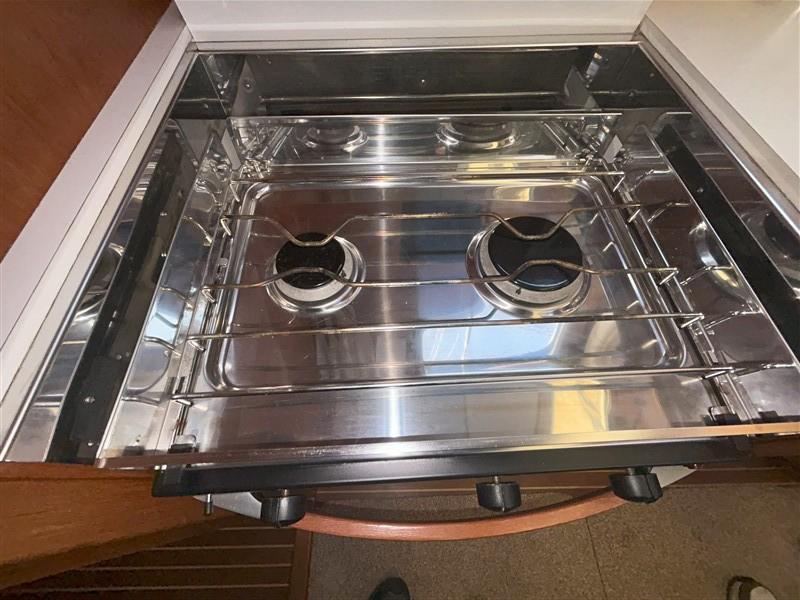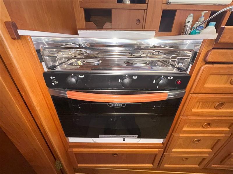 Galley: 12V Fridge / Freezer (ISOTHERM SP2051), ENO 2 Burner Gas Hob, Oven and Grill (Spare Glass Door), Sink, Storage, Generous Work Surface, Electrolux Compact 600 Microwave. 4 Seat Dining Table Opposite, Convert to Double Berth (with Cushions).