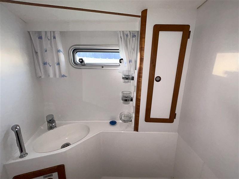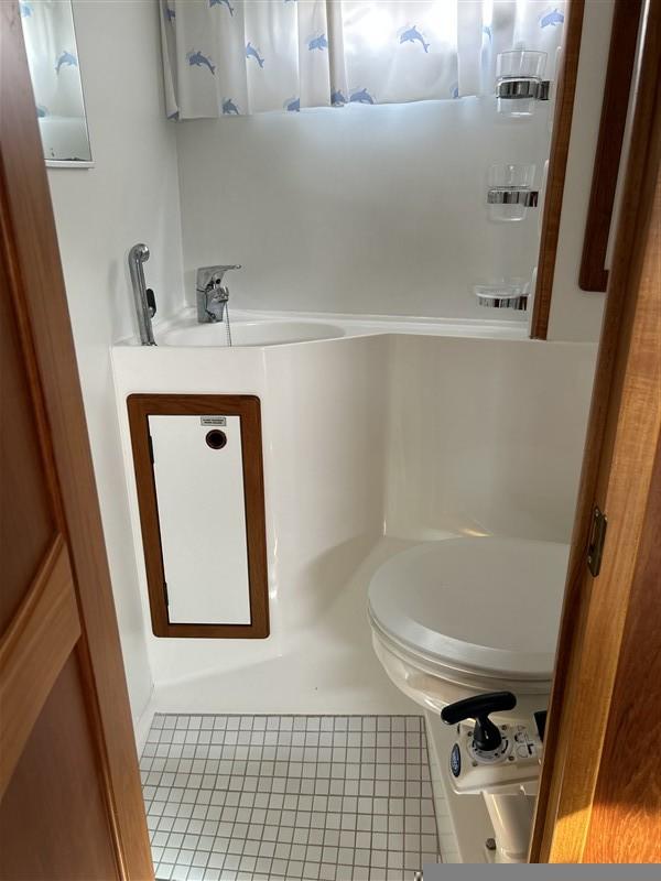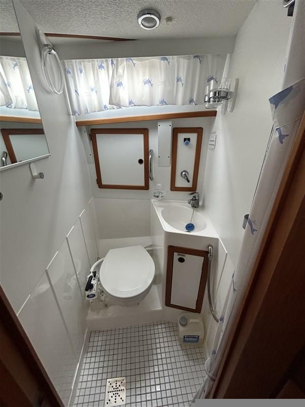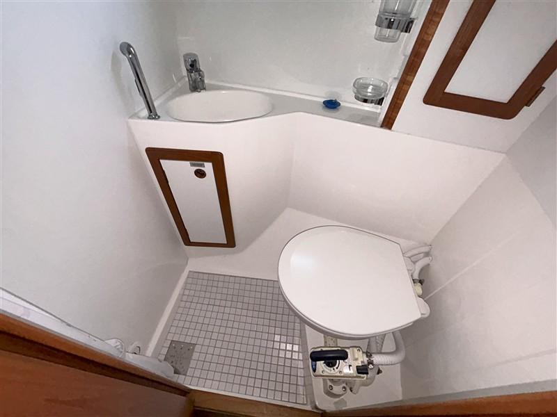 Forward Heads: Jabsco Sea-Toilet, Sink, Shower, Storage.