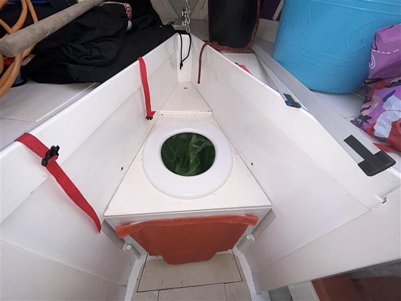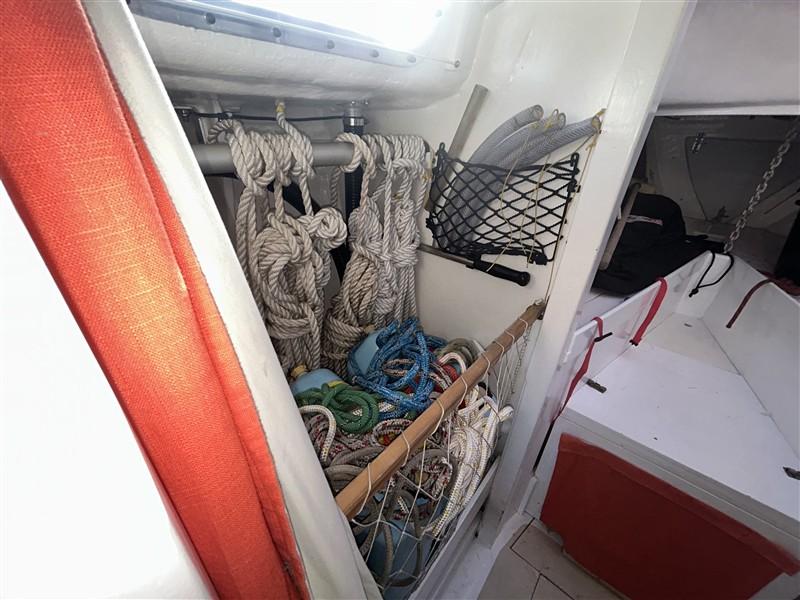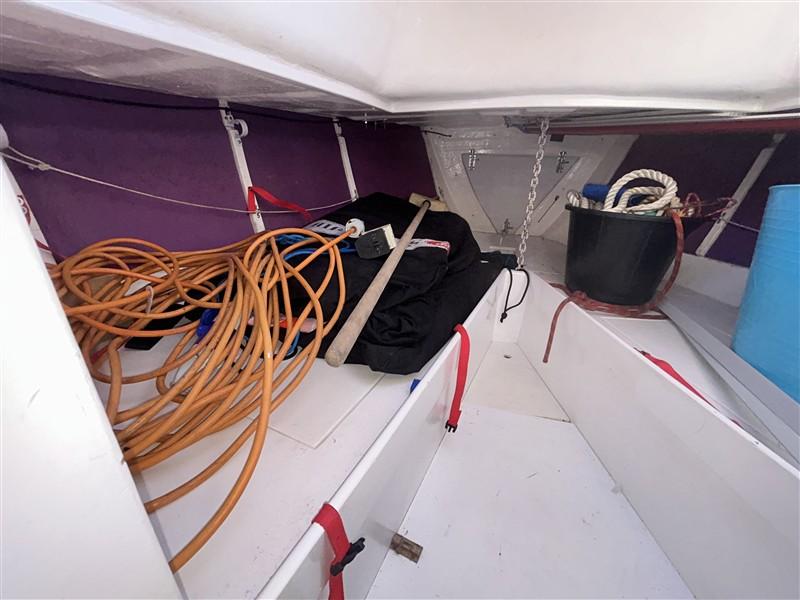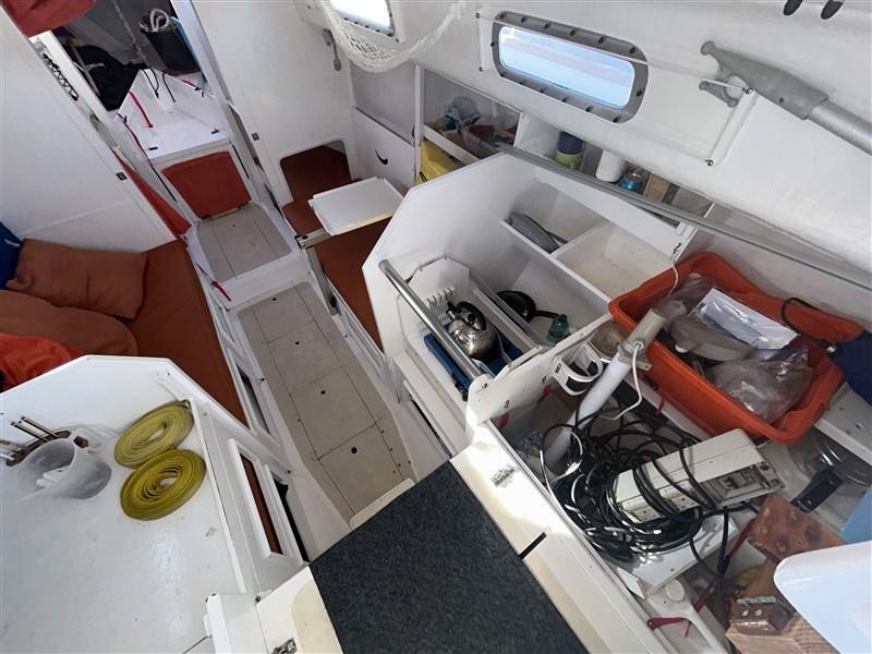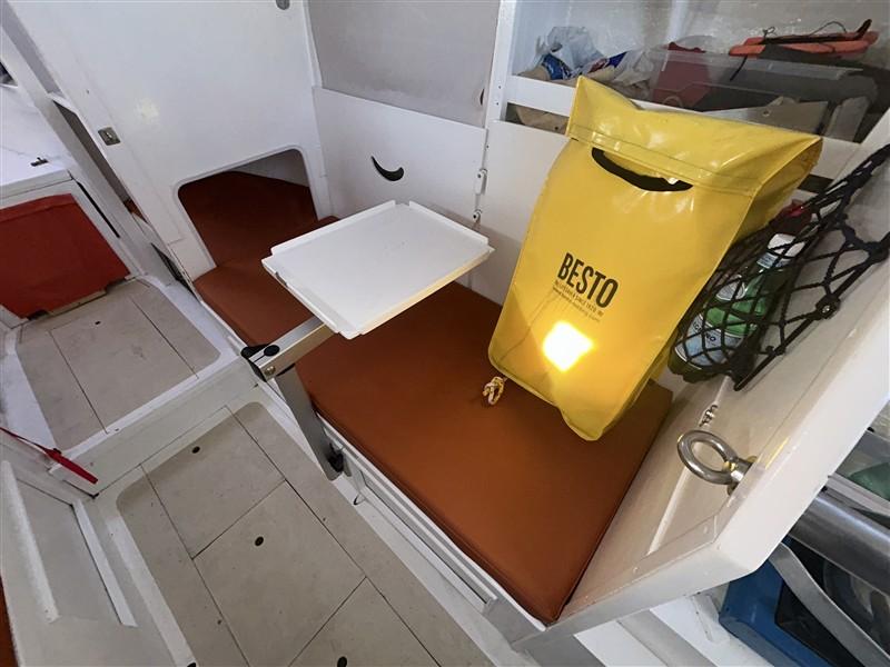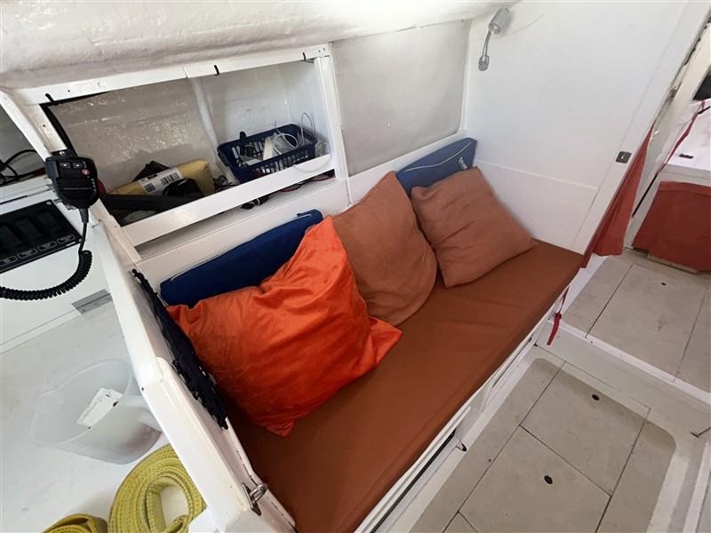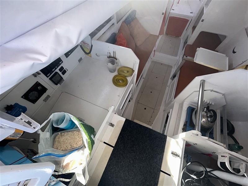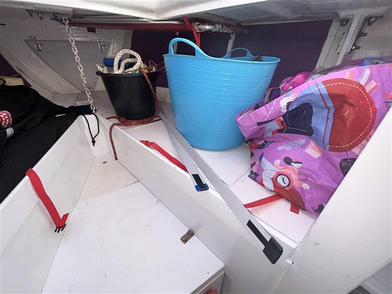 To Starboard: Galley (Portable Gas Cartridge Stove), Seating and Storage further forward.
